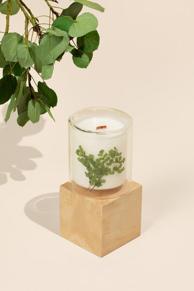 Ultra long-lasting (75 hrs+ with optimal burn conditions); soy wax; wood wick; artisanal reusable vessel. 13 oz.