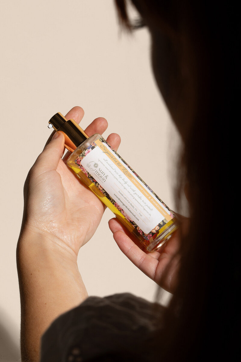 Sun & Moon's signature rose hip body oil blend, infused with our own backyard garden roses! Silky & luxe.